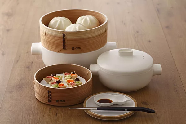 JIA Inc.品家家品邀請瑞典及蘇格蘭設計師「Office for Product Design」,以經典的竹蒸籠作發想,加入當代設計項目,同時尊重其獨特的傳統意義,不僅外觀設計極簡優雅,在功能上更為之注入新意。其鍋身以優質耐火土製成,對溫度變化有卓越的耐受性,打破一般陶瓷無法直火加熱的限制。手工製成的柳杉木蒸籠,由老師傅精心手造,呈現異材質結合的工藝之美。柳杉木獨特的香氣于烹煮時滲透至食物中,使食物帶有醇厚木質的芬芳。此外,蒸籠以透氣吸水的赤陶代替一般全竹的底盤,使蒸煮的食材不含過多水氣,避免食材過度濕軟。