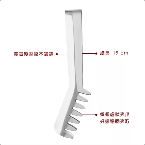 本商品一件入、適用洗碗機;請遠離直接火源、料理時請勿長時間將握柄靠至鍋緣,可能受損或高溫燙傷。料理或分食細長的義大利麵條時,您最需要一款抓力強的餐夾。霧銀髮絲紋不鏽鋼質感,略微傾斜角度搭配齒狀夾爪,好拿握且輔助穩固夾取麵條,是廚房不可或缺的好幫手;可吊掛收納省空間。