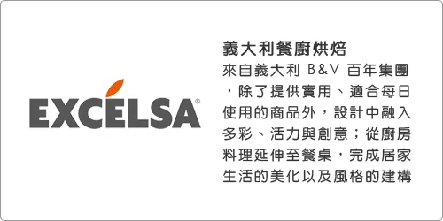 來自義大利 B&V 百年集團的 EXCELSA,核心價值源於對家的美好願景,並實踐於餐廚、烘焙用品上。除了致力提供實用、適合每日使用的商品外,設計中亦融入多彩、活力與創意,將溫度渲染至家中每一個角落,同時完成居家生活的美化以及風格的建構。
